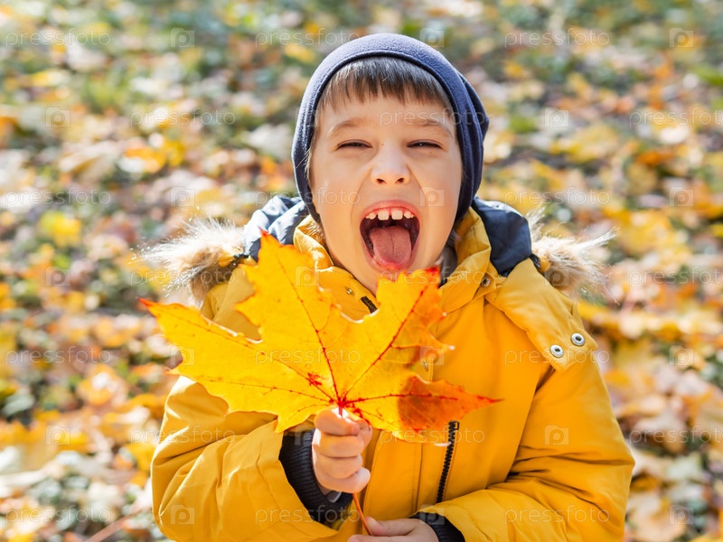 Счастливый мальчик показывает полость рта за букетом ярко-желтых кленовых листьев. Осеннее веселье с опавшими листьями в парке. Активный отдых на свежем воздухе