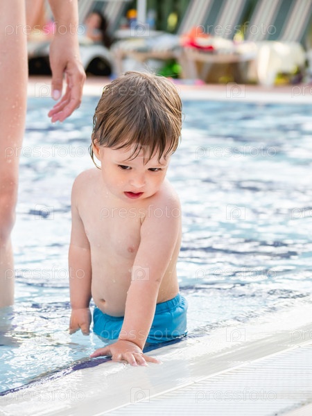 Малыш плавает в детском бассейне. Обучение детей плаванию с раннего детства. Спорт, активный образ жизни и физическое развитие