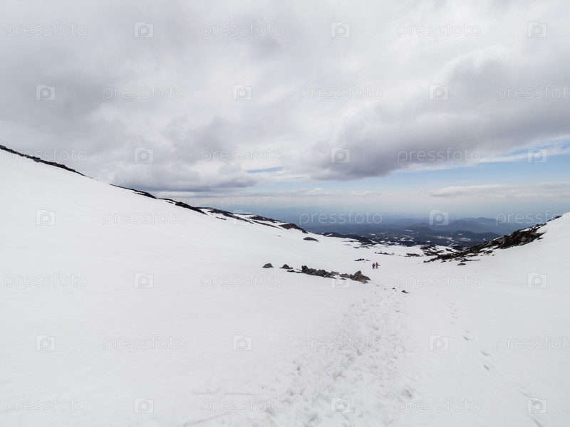Туристы спускаются со стратовулкана Плоский Толбачик. Следы на заснеженных склонах вулкана. Пешие прогулки по полуострову Камчатка, Россия