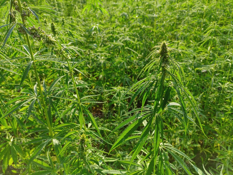Сельскохозяйственное поле конопли или конопли. Выращивание однолетнего травянистого цветкового растения для промышленных нужд