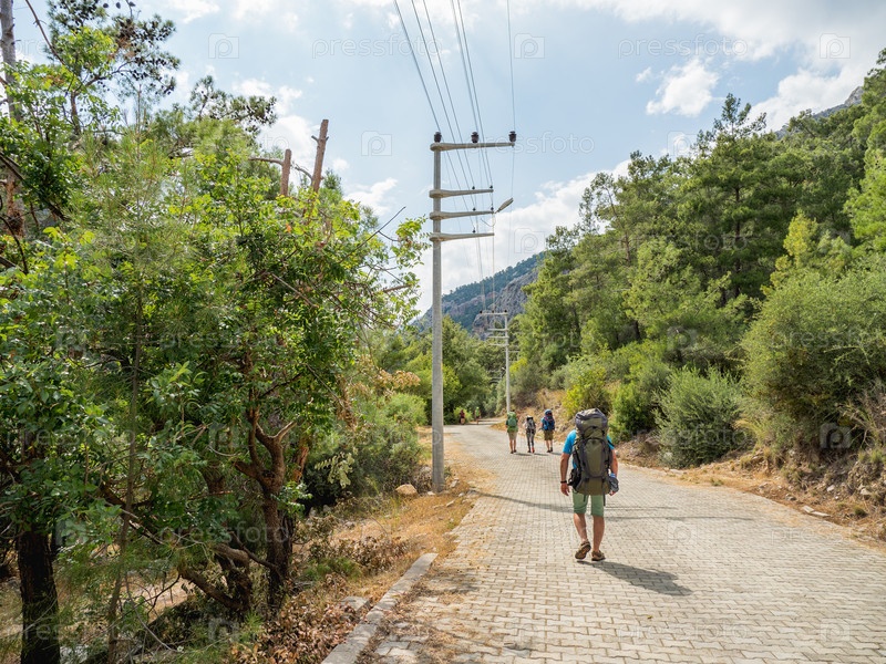 Туристы с рюкзаками идут к каньону Гейнюк. Мощеный путь вдоль горных склонов в прибрежном национальном парке Бейдаглари. Турция