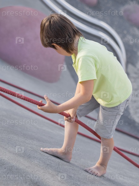 Мальчик поднимается по бетонному склону современной детской спортивно-игровой площадки. Малыш преодолевает страх и учится новому. Активный отдых на природе. Спортивный образ жизни