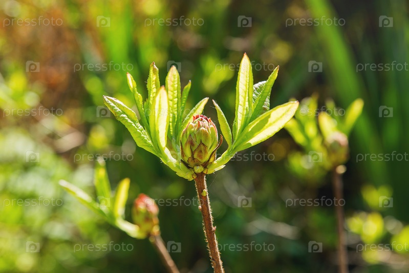 Рододендрон Молле. Бутоны с яркими цветами на зеленом естественном фоне. Солнечное весеннее утро в саду