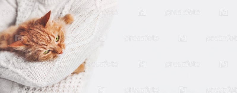 Женщина в белом вязаном свитере держит на руках рыжего кота. Пушистый питомец с недовольным выражением лица. Светлый баннер с копией пространства