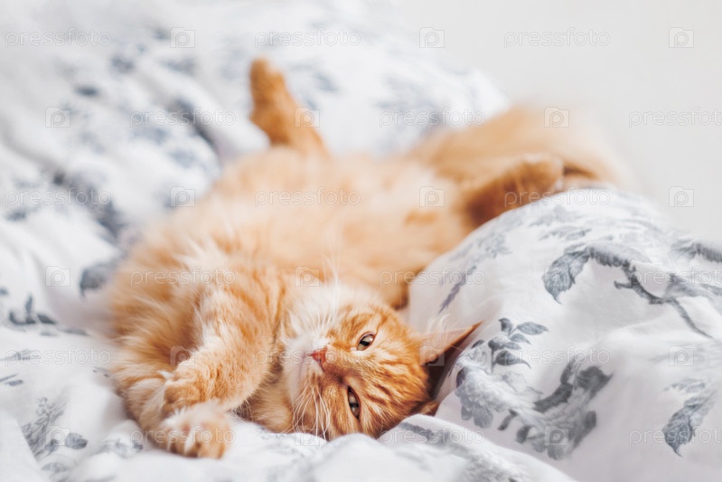 Сонный рыжий кот лежит в постели. Пушистый питомец на белье в освещенной солнечным светом спальне. Уютный домашний фон