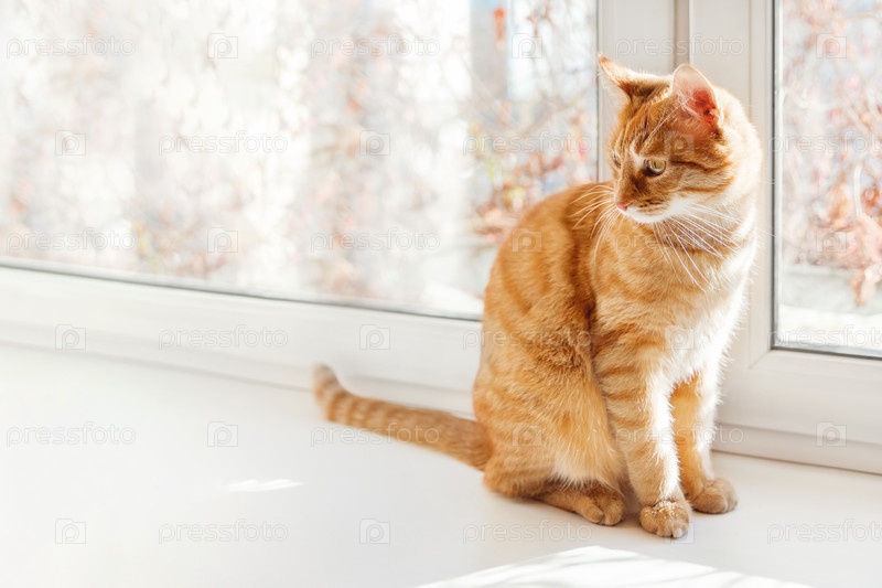 Любопытный рыжий кот сидит на подоконнике. Пушистый питомец дома. Домашнее животное на горизонтальном баннере с копией пространства