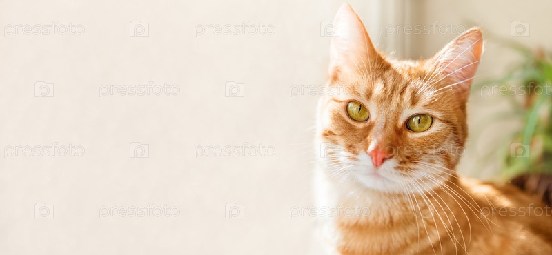 Крупным планом портрет рыжего кота на подоконнике. Пушистый питомец и комнатное растение с зелеными листьями. Домашнее животное на горизонтальном баннере с копией пространства