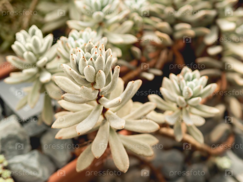Крупным планом фото Эхеверии на размытом фоне коллекции различных суккулентных растений. Ботаническое хобби или выращивание для гибридизации