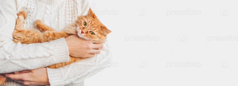 Женщина в белом вязаном свитере держит на руках рыжего кота. Пушистый питомец с испуганным выражением лица. Светлый баннер с копией пространства