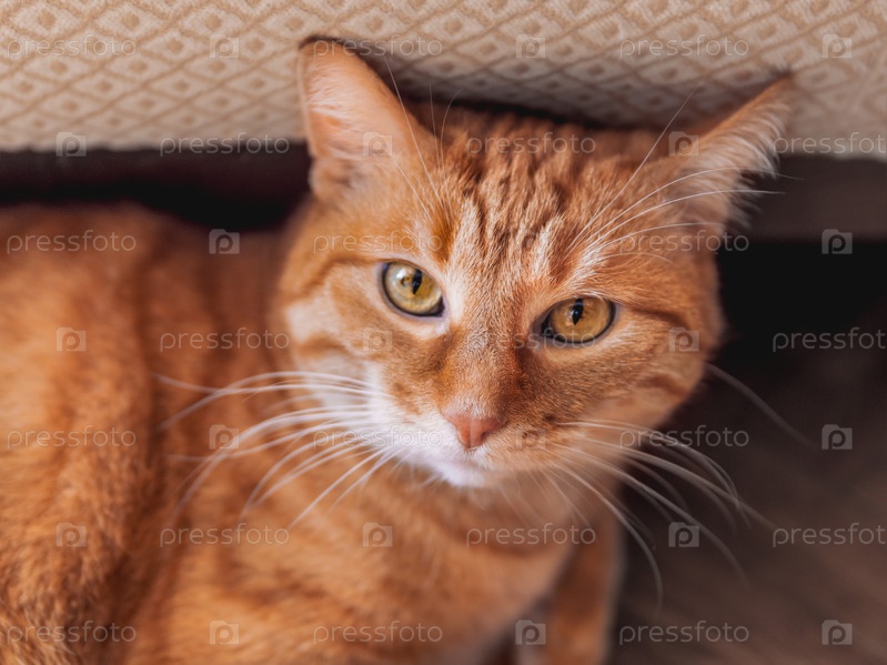 Рыжий полосатый кот лежит возле бежевого дивана. Питомец с любопытной эмоцией на лице. Расслабленное домашнее животное
