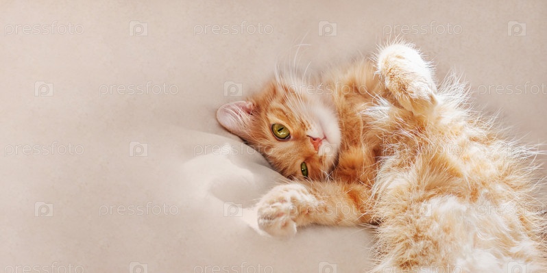 Милый рыжий кот спит на одеяле в постели. Пушистый питомец с любопытным забавным выражением лица. Бежевый фон с копией пространства