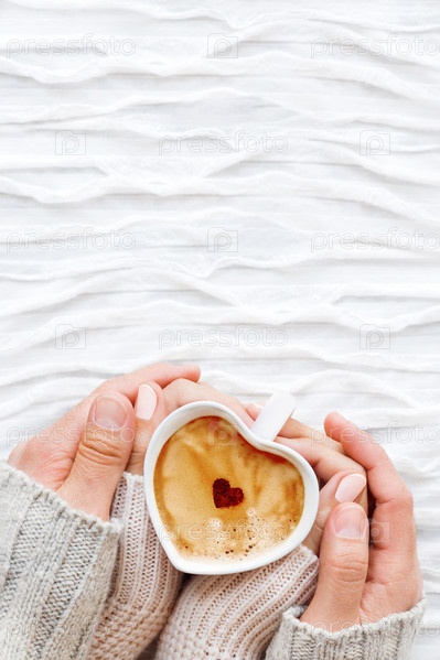 Вид сверху на руки женщины и мужчины с чашкой горячего кофе с коричным сердцем. Символ любви. Зима и день святого валентина фон с копией пространства