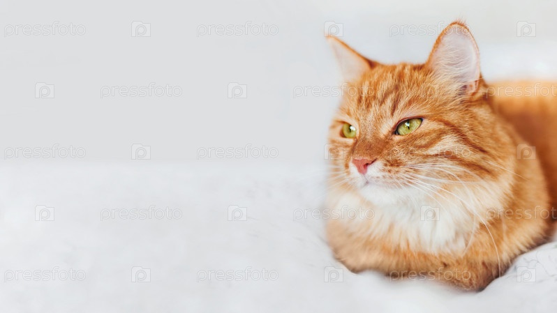 Милый рыжий кот лежит в постели под одеялом. Пушистый питомец уютно устроился спать. Уютный фон с копией пространства