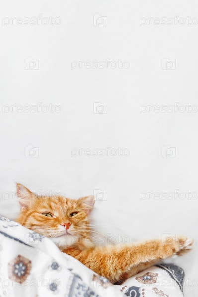 Вид сверху на милую рыжую кошку, лежащую в постели под одеялом. Пушистый питомец уютно устроился спать. Уютный домашний фон с забавным питомцем и копией пространства