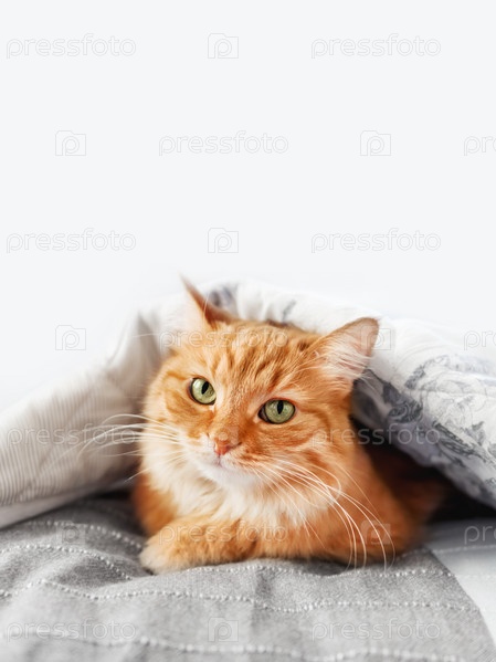 Недовольный рыжий кот прячется под одеялом. Пушистый питомец пытается сохранить тепло. Уютный домашний фон в холодное время года без центрального отопления