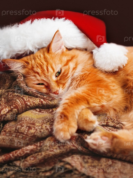 Милый рыжий кот в шапке Санта-Клауса спит на красочном шарфе. Пушистый питомец с новогодним украшением готов к празднованию Рождества