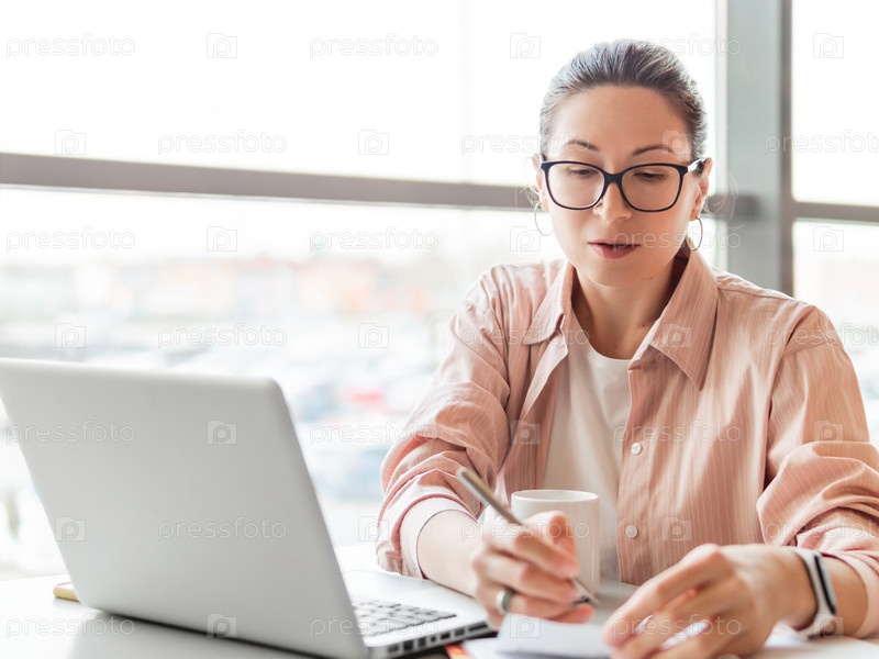 Женщина в очках работает с ноутбуком и рукописными заметками в блокноте. Современный офис с панорамными окнами в коворкинг-центре. Рабочее место для фрилансеров или студентов в бизнес-центре
