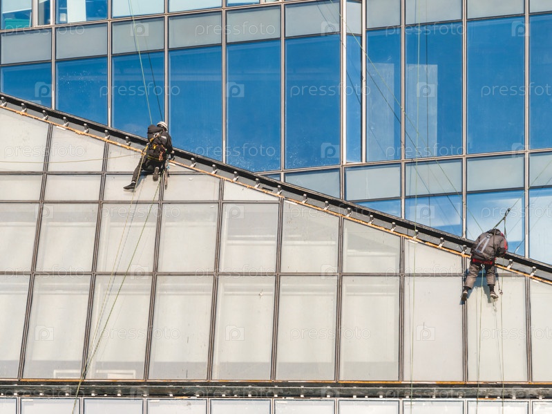 Два промышленных альпиниста с страховочными тросами моют окна или ремонтируют стены современного небоскреба. Опасная работа в мегаполисе