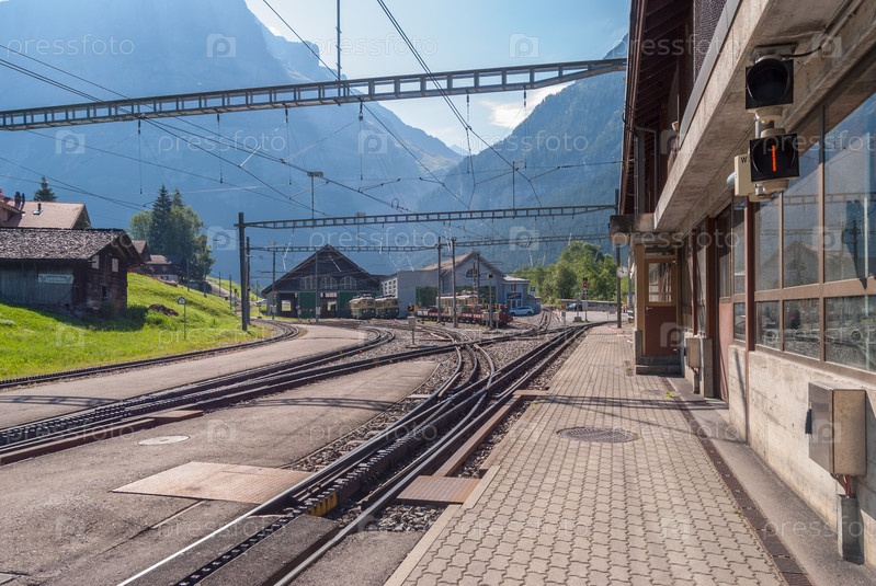 Железнодорожная станция Grindelwald Grund расположена в Бернском Оберланде, Швейцария июль 2018 г