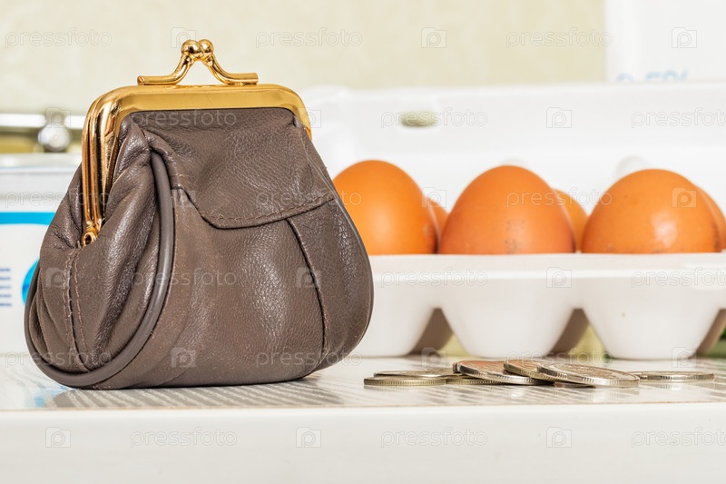 Бумажник, калькулятор, продукты. концепция расчета ежедневных расходов