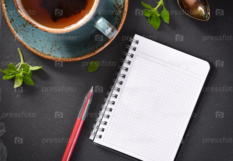 Открытая тетрадь на грифельной доске. Вид сверху. Концепция рецепта
