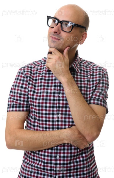 Модный случайный мужчина думает и смотрит вверх