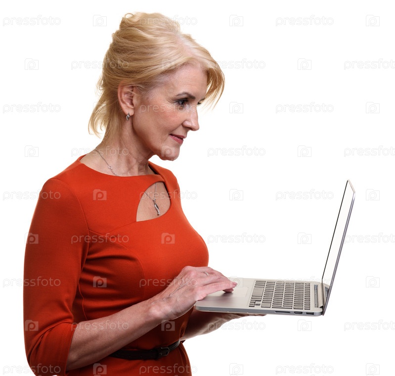 Счастливая пожилая женщина с помощью портативного компьютера
