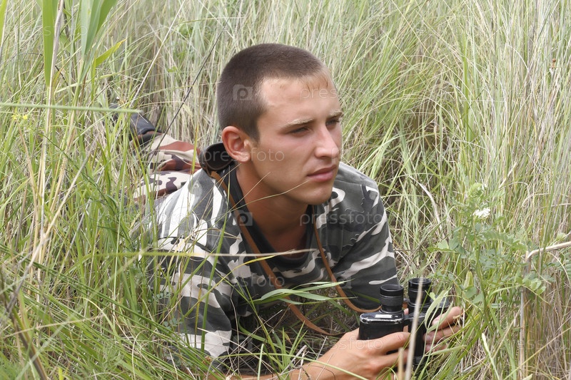 Мужчина с биноклем в траве