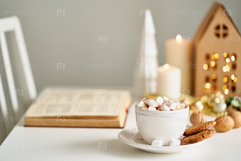 Рождественский светло-серый фон с копией пространства. Чтение книги уютным зимним вечером со свечами