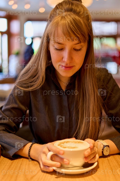 Молодая кавказская женщина держит чашку кофе и смотрит на горячий напиток за столом в кафе