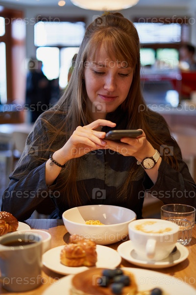 Женщина фотографирует сладкую выпечку и капучино с пеной на пару в кафе