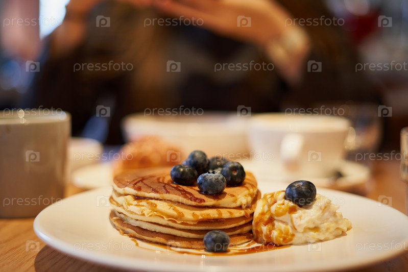Сладкие блинчики с карамельным сиропом, черникой и мороженым на тарелке в кафе
