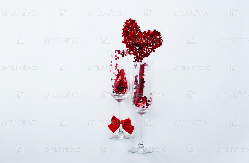 Очки конфетти в форме сердца на белом фоне. Плоская планировка, вид сверху. Концепция праздника и празднования
