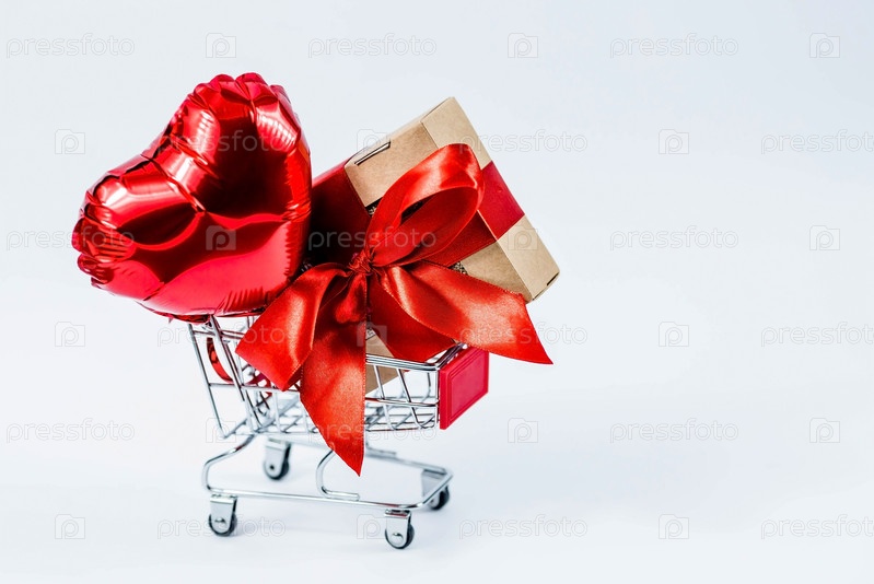 Корзина с едой, подарочная коробка и воздушный шар в форме сердца. Интернет-магазины. Зимние праздничные распродажи, Сезонные распродажи, Черная пятница, 14 февраля, День святого Валентина. Скидки и покупки на месте