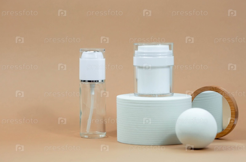 Сцена с геометрическими фигурами. Минимальные ящики и геометрический подиум. Пустые контейнеры с лосьоном, кремом на бежевом фоне, плоский вид сверху. Натуральная органическая косметика. Макет салона красоты