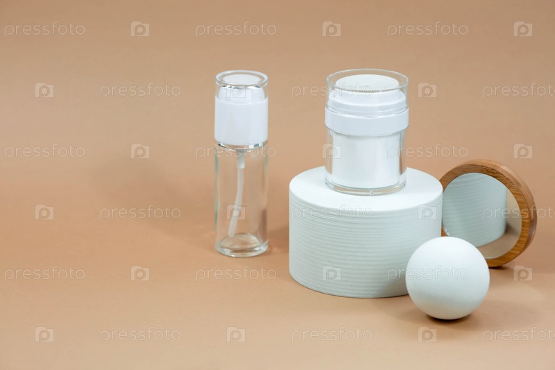 Сцена с геометрическими фигурами. Минимальные ящики и геометрический подиум. Пустые контейнеры с лосьоном, кремом на бежевом фоне, плоский вид сверху. Натуральная органическая косметика. Макет салона красоты