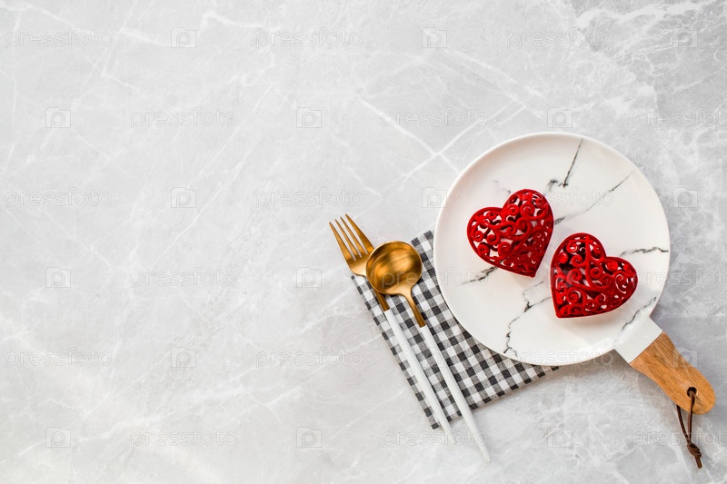 Баннер. Сервировка стола. Модная мраморная тарелка с салфеткой, вилкой и красными сердечками на сером фоне. Концепция праздника Дня святого Валентина для кафе и ресторанов. Копия места для текста