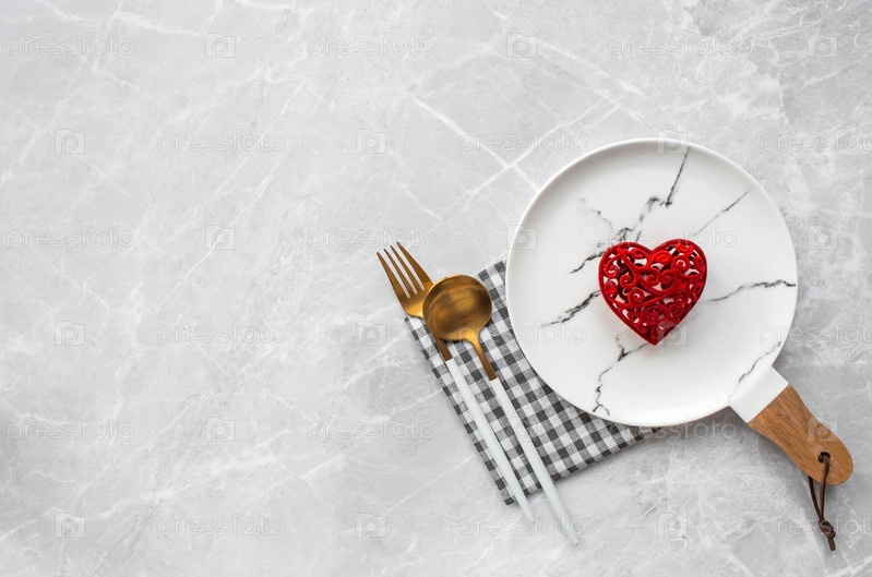 Баннер. Сервировка стола. Модная мраморная тарелка с салфеткой, вилкой и красными сердечками на сером фоне. Концепция праздника Дня святого Валентина для кафе и ресторанов. Копия места для текста