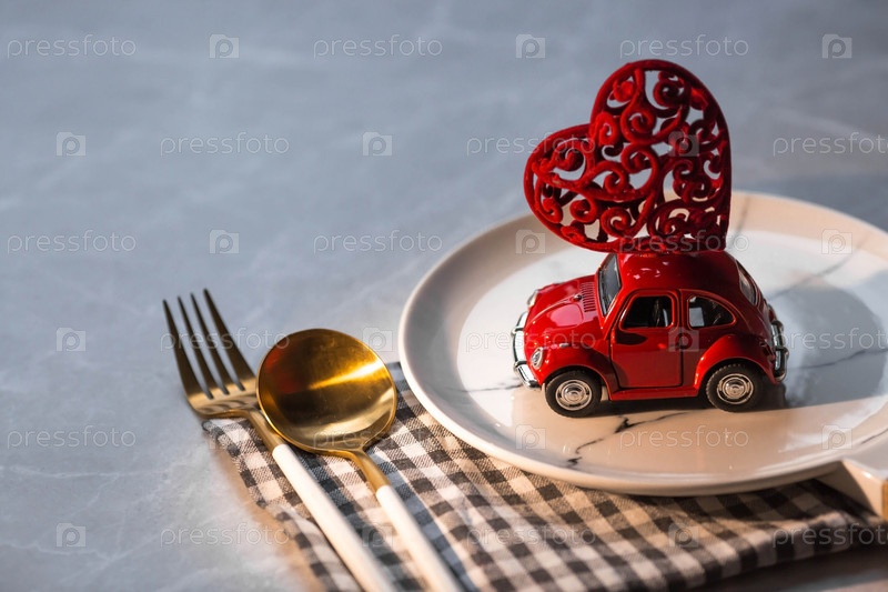 Москва, Россия-январь 2022 года: красная ретро игрушечная машинка на тарелке с сердцем на крыше. Концепция доставки еды из кафе и ресторанов в День святого Валентина. Карантин в городе из-за коронавируса
