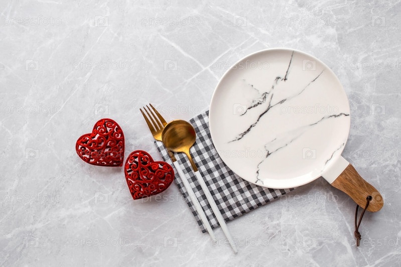 Баннер. Сервировка стола. Модная мраморная тарелка с салфеткой, вилкой и красными сердечками на сером фоне. Концепция праздника Дня святого Валентина для кафе и ресторанов. Копия места для текста