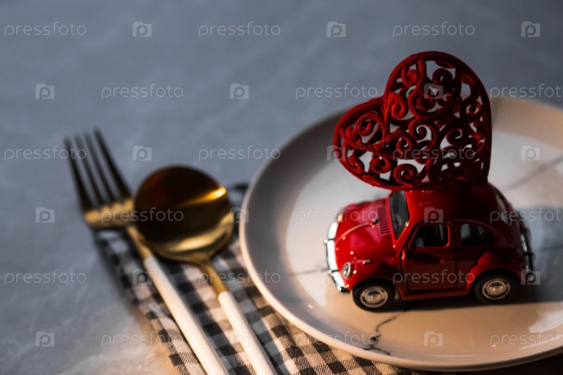 Москва, Россия-январь 2022 года: красная ретро игрушечная машинка на тарелке с сердцем на крыше. Концепция доставки еды из кафе и ресторанов в День святого Валентина. Карантин в городе из-за коронавируса