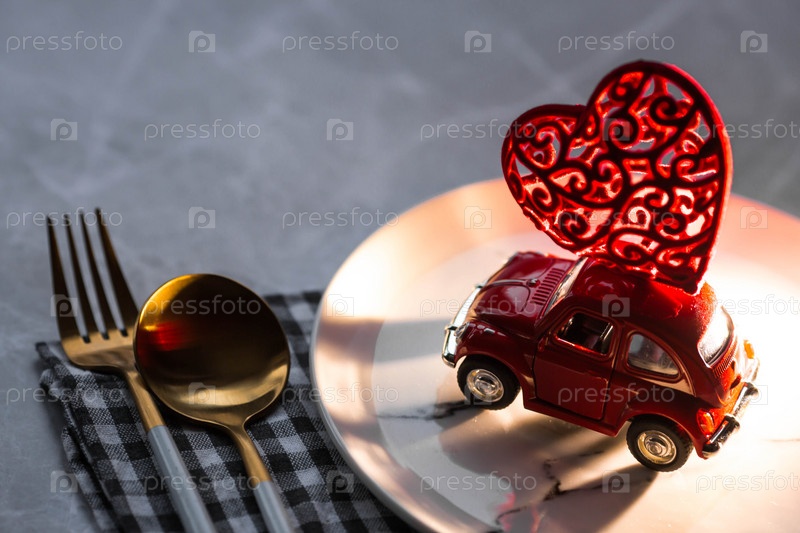 Москва, Россия-январь 2022 года: красная ретро игрушечная машинка на тарелке с сердцем на крыше. Концепция доставки еды из кафе и ресторанов в День святого Валентина. Карантин в городе из-за коронавируса