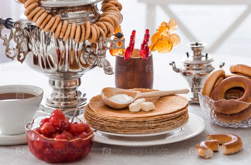 Русские традиции. Русский праздник Масленица. Натюрморт с чашкой чая, стопкой блинов, сметаной, медом, кубиками масла, рогаликами, сухофруктами, карамельным петушком и самоварами