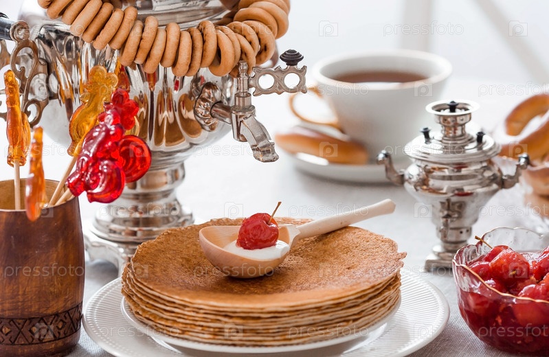 Русские традиции. Русский праздник Масленица. Натюрморт с чашкой чая, стопкой блинов, сметаной, медом, кубиками масла, рогаликами, сухофруктами, карамельным петушком и самоварами