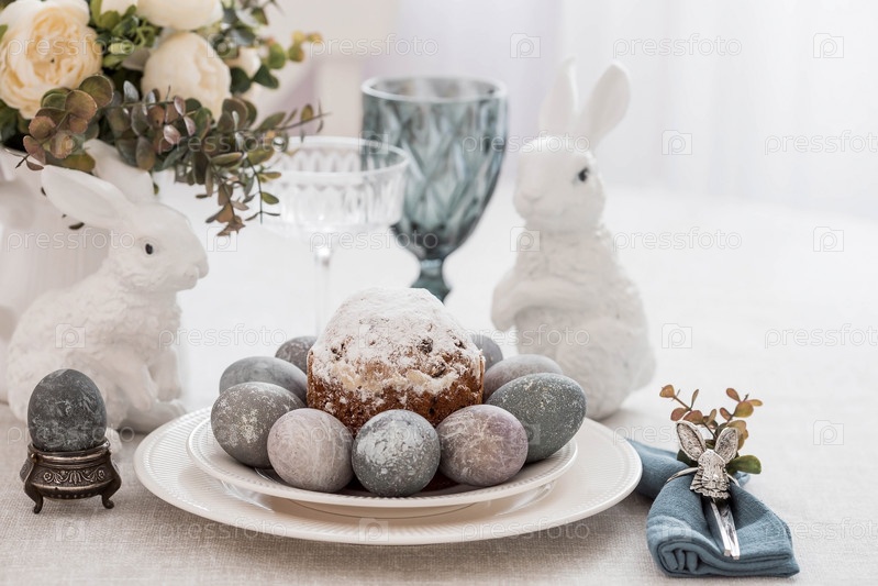 Весенняя сервировка стола. Тарелка с хлопковой салфеткой с зайчиком, тортом и пасхальными яйцами. Столовое серебро, пасхальные кролики и ваза с цветами на льняной скатерти. Концепция светлого праздника Пасхи
