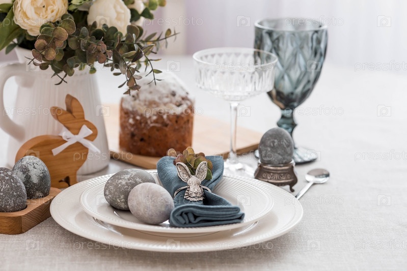 Весенняя сервировка стола. Тарелка с хлопковой салфеткой с зайчиком, тортом и пасхальными яйцами. Столовое серебро, пасхальные кролики и ваза с цветами на льняной скатерти. Концепция светлого праздника Пасхи