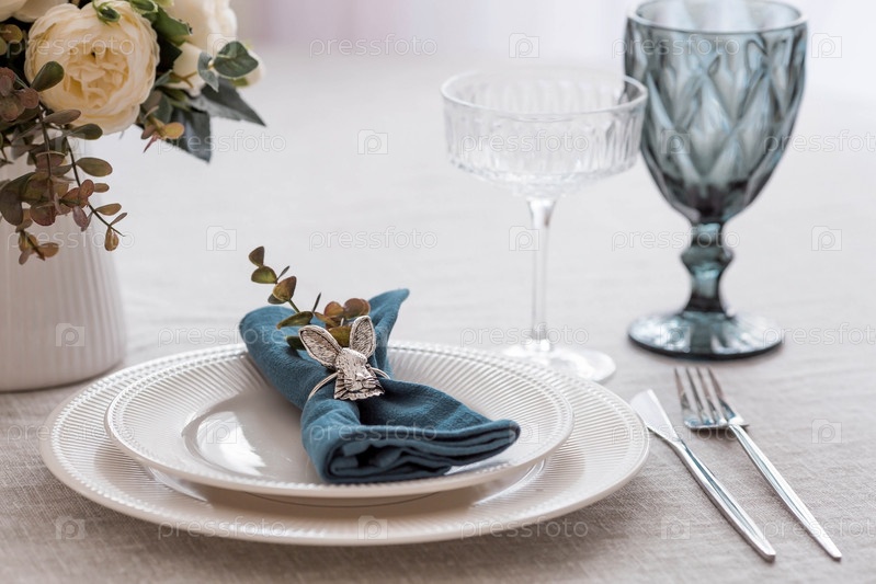 Красивая весенняя сервировка стола. Тарелка с хлопковой салфеткой с зайчиком. Столовое серебро и ваза с цветами на льняной скатерти. Концепция праздничной сервировки и яркого праздника Пасхи