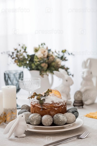 Весенняя сервировка стола. Тарелка с хлопковой салфеткой с зайчиком, тортом и пасхальными яйцами. Столовое серебро, пасхальные кролики и ваза с цветами на льняной скатерти. Концепция светлого праздника Пасхи