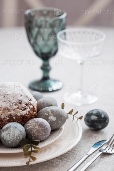 Весенняя сервировка стола. Тарелка с хлопковой салфеткой с зайчиком, тортом и пасхальными яйцами. Столовое серебро, пасхальные кролики и ваза с цветами на льняной скатерти. Концепция светлого праздника Пасхи