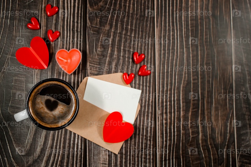 Кружка горячего черного кофе, красные сердца, конверт и белый лист бумаги для текста на деревянном фоне с копией пространства. Концепция праздничного утра